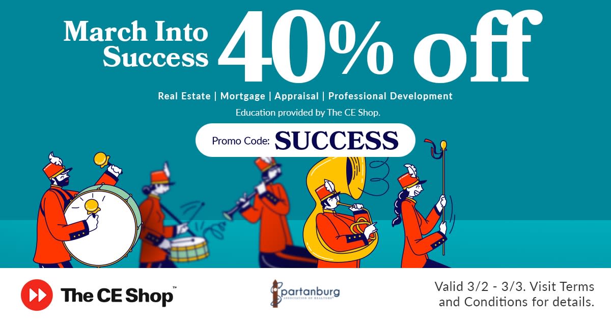 March is the perfect time to move forward with purpose. Take 40% off Licensing and Continuing Education when you visit https://SpartanburgRealtors.TheCEShop.com and use code SUCCESS at checkout. Save on Real Estate and Professional Development courses. 📅 Valid 3/2–3/3 only.